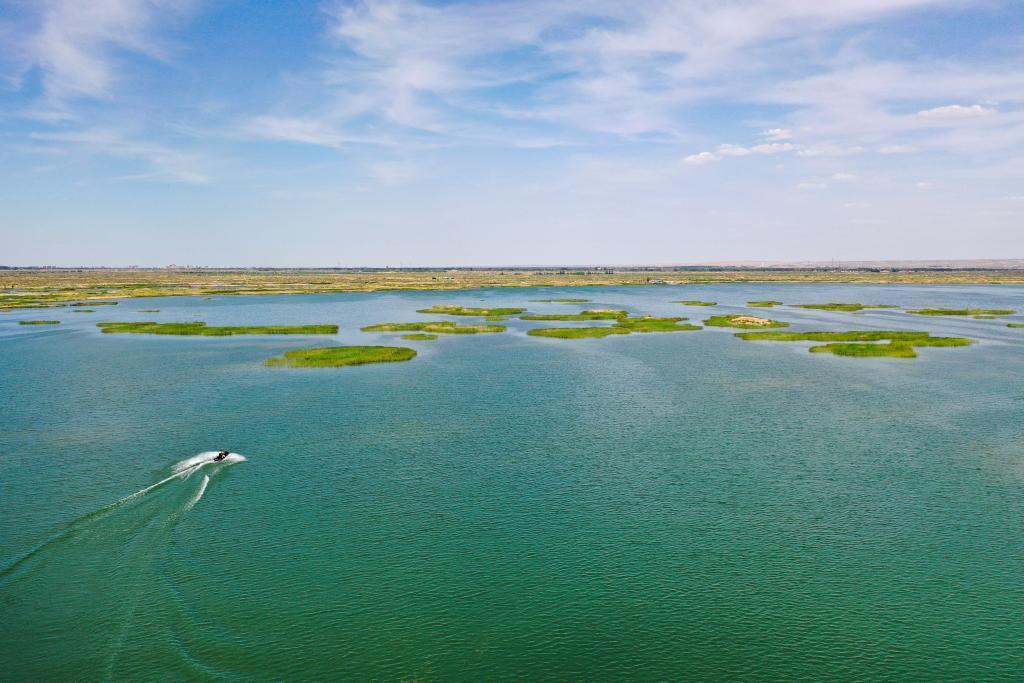 6月5日,在巴彥淖爾市磴口縣奈倫湖國家濕地公園,摩托艇行駛在湖面上(無人機(jī)照片)。黃河“幾字彎”逐漸展現(xiàn)“金沙藍(lán)海綠洲”的美麗畫卷。新華社記者 李志鵬 攝