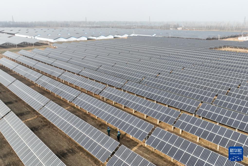 1月17日拍攝的河北省贊皇縣院頭鎮(zhèn)曹家莊村附近的“風(fēng)光互補(bǔ)”發(fā)電場(chǎng)(無(wú)人機(jī)照片)。