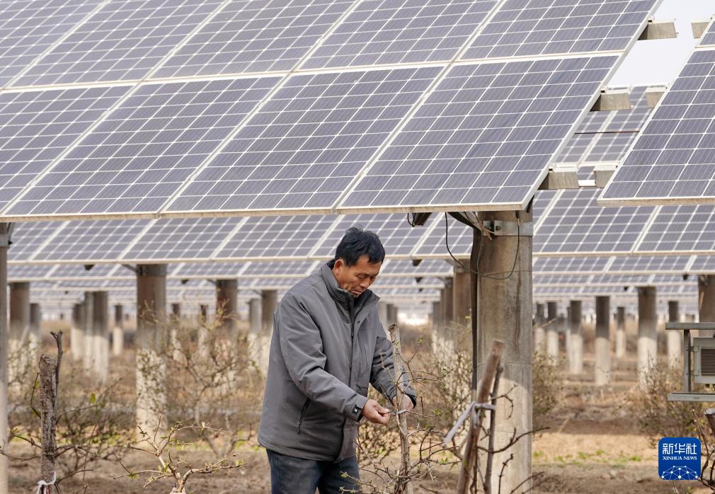 1月16日,河北省巨鹿縣閻疃鎮(zhèn)的一名農(nóng)民在“農(nóng)光互補(bǔ)”光伏板下管護(hù)金銀花苗。