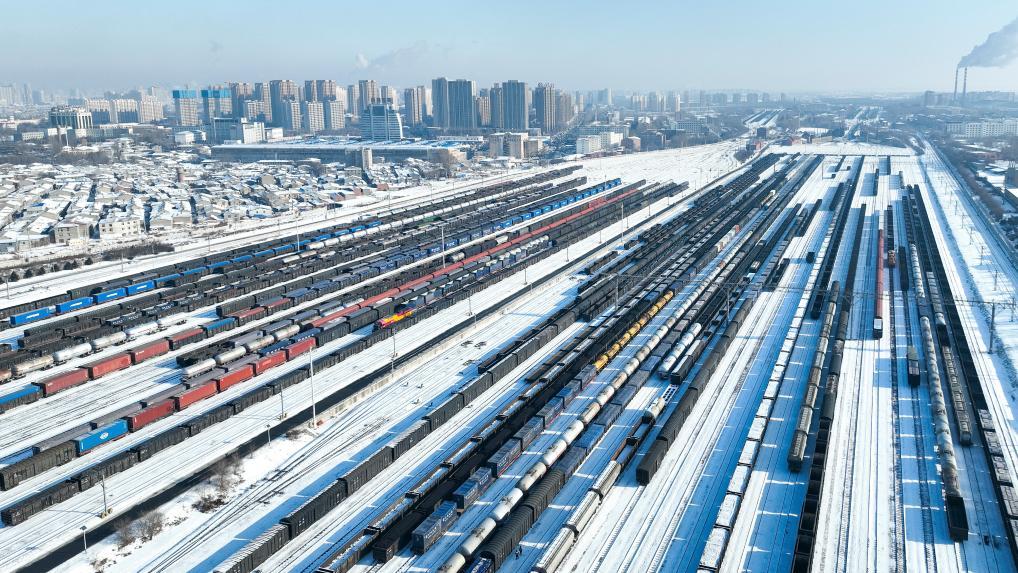 裝滿物資的貨運(yùn)列車在黑龍江省哈爾濱南站編組站場(chǎng)整裝待發(fā)?!叭拧碧煲詠?lái),針對(duì)北方降溫降雪天氣,中國(guó)鐵路哈爾濱局集團(tuán)有限公司哈爾濱南站積極開(kāi)展電煤、生產(chǎn)物資保供專項(xiàng)行動(dòng),全力保障民生物資運(yùn)輸需求(2026年1月15日攝,無(wú)人機(jī)照片)。新華社發(fā)(原勇 攝)