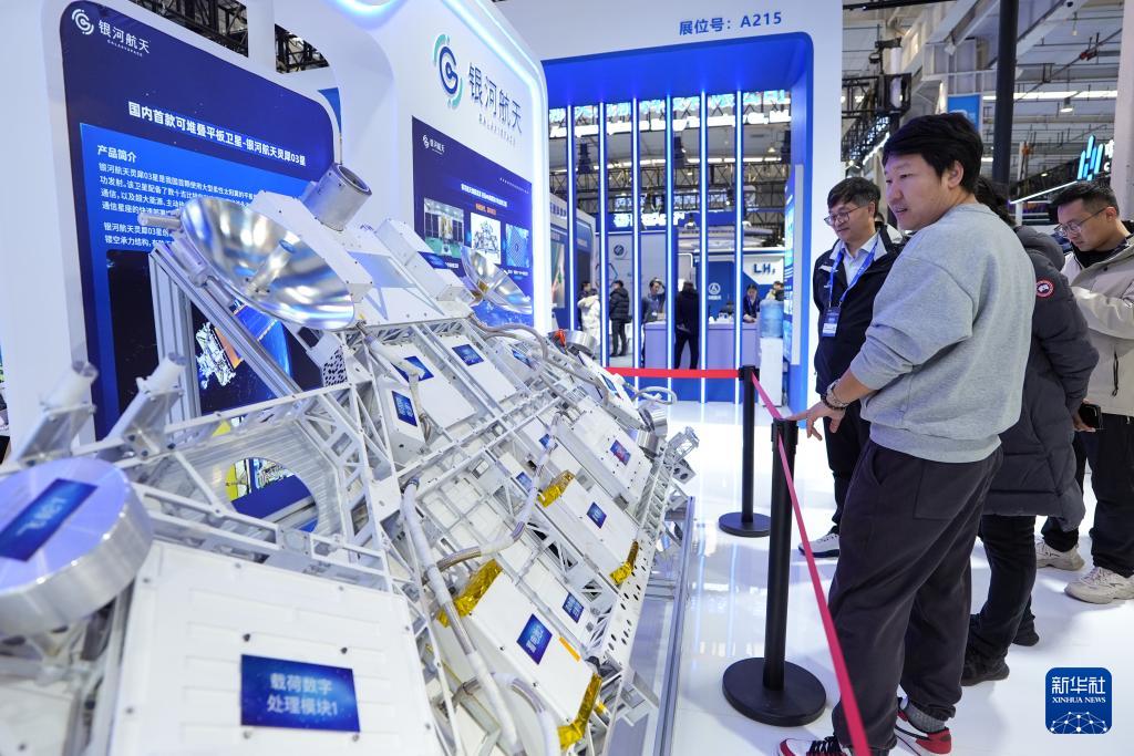 1月23日,觀眾在2026北京國際商業(yè)航天展的銀河航天展臺參觀展出的可堆疊平板衛(wèi)星“靈犀03星”模型。