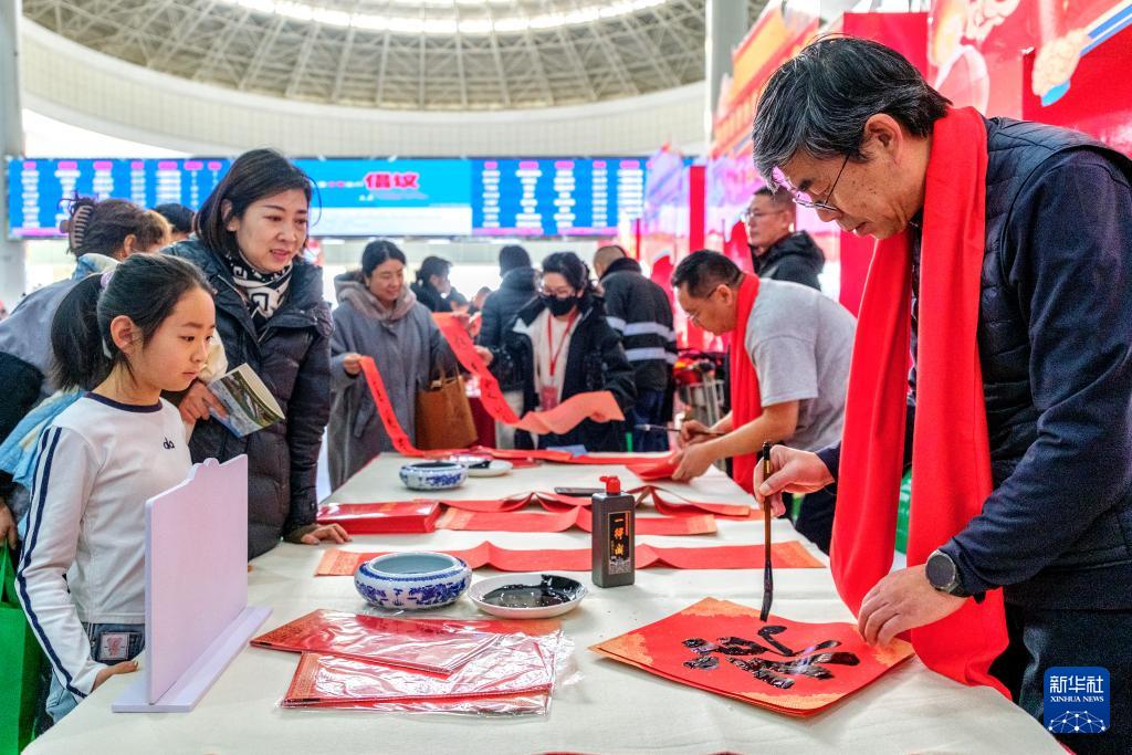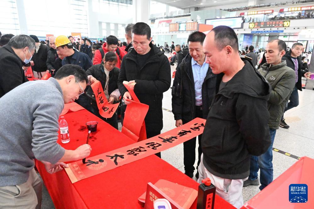 2月2日,在內(nèi)蒙古呼和浩特市呼和浩特東站,書法家為旅客們現(xiàn)場寫春聯(lián)。