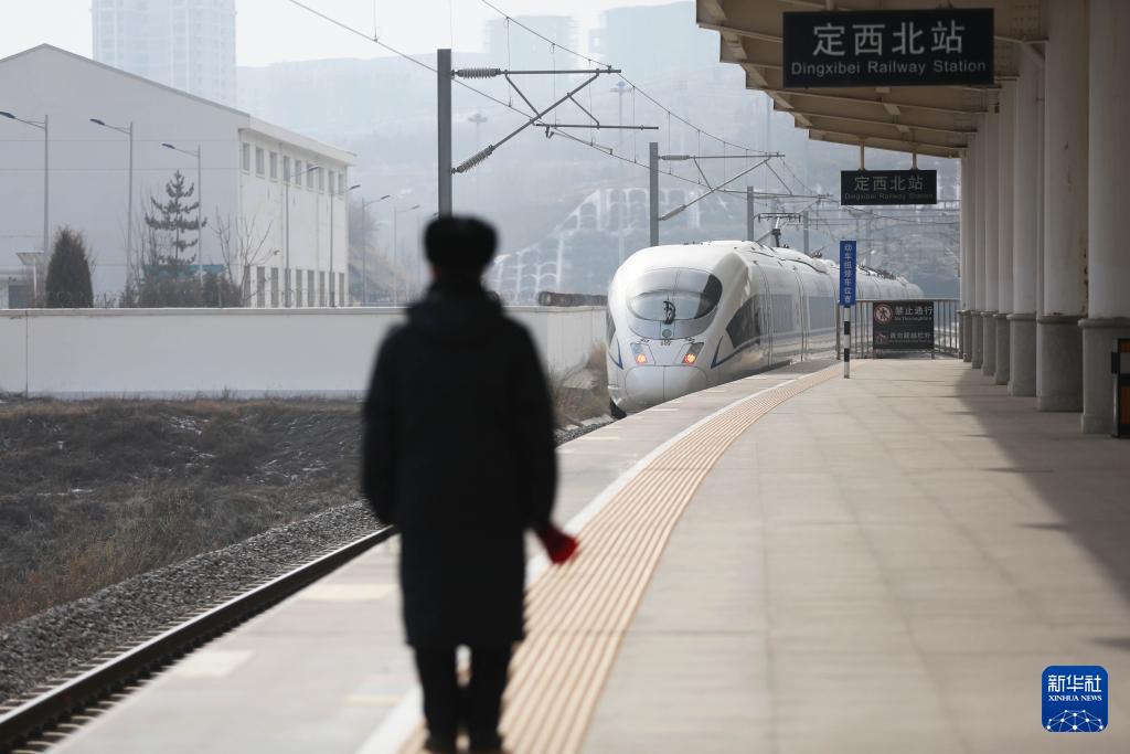 2月2日,寶蘭高鐵甘肅定西北站的工作人員在送車。