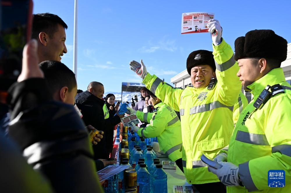 2月2日,在烏尉高速公路永豐服務(wù)區(qū),烏魯木齊市公安局交管支隊烏拉泊大隊民警向過往司乘人員進行安全出行宣傳。