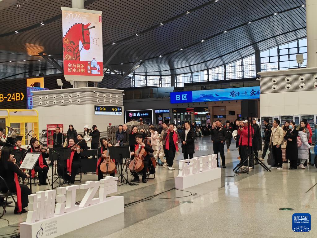 2月2日,旅客在長沙南站候車廳欣賞交響樂演奏。