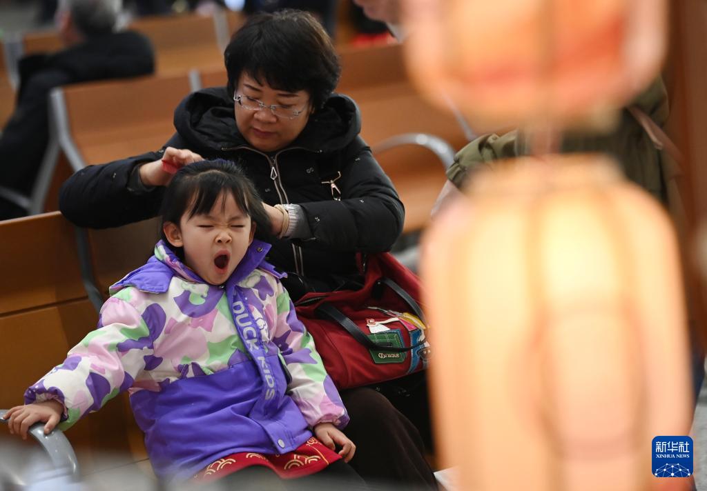 2月2日,在西安站候車大廳,一位旅客在候車期間為孩子梳頭。