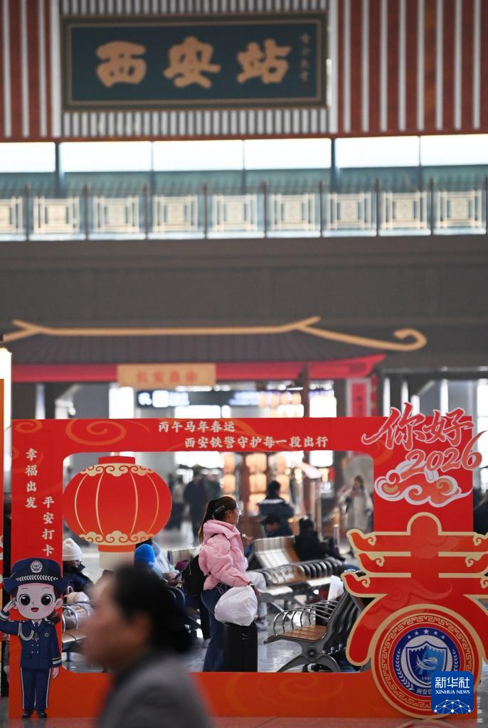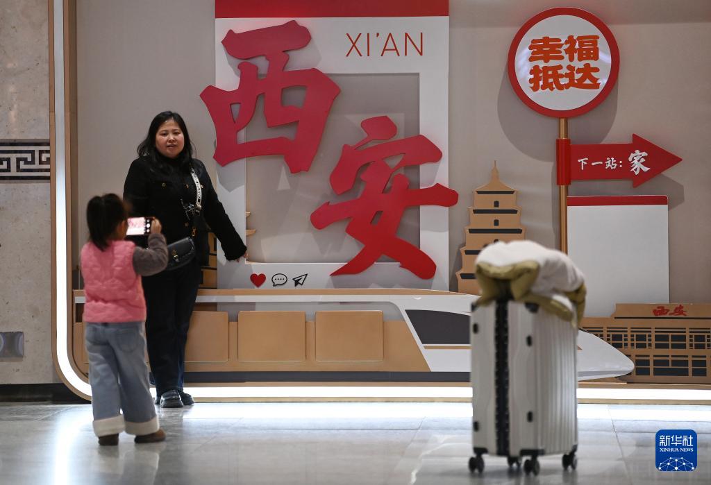 2月2日,旅客在西安站候車大廳的主題文化墻前留影。