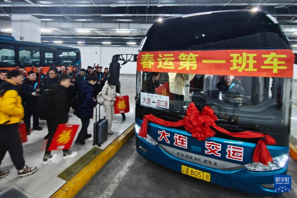2月2日清晨,旅客在遼寧大連長途汽車站乘坐大連交運集團“春運第一班車”返鄉(xiāng)。