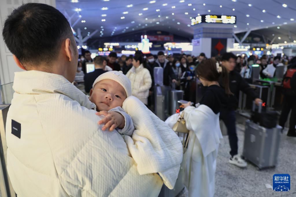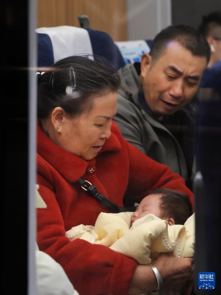 2月2日,搭乘2026年深圳地區(qū)春運首班車C7152次深圳北到岳陽東列車的乘客在車上照顧嬰兒。