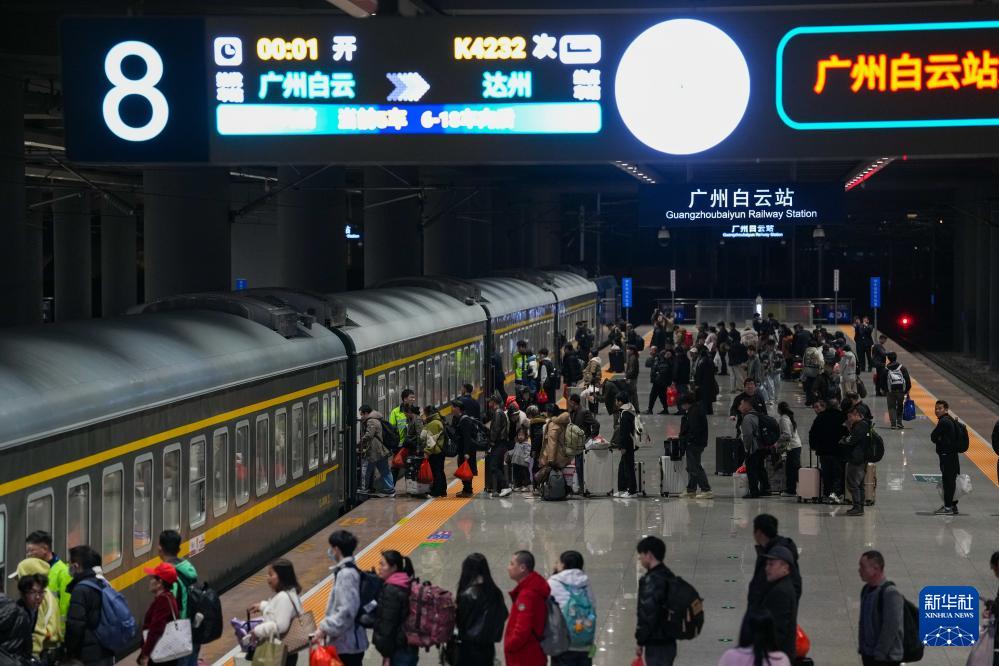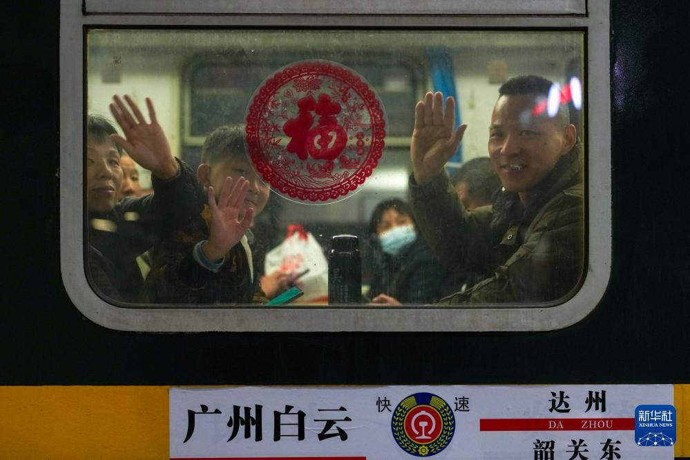 2月1日深夜,在廣州白云站,乘坐K4232次列車的旅客們揮手告別。2月2日凌晨0時01分,開往四川達州的K4232次列車緩緩駛離廣州白云站,這是2026年粵港澳大灣區(qū)開出的首趟春運列車。