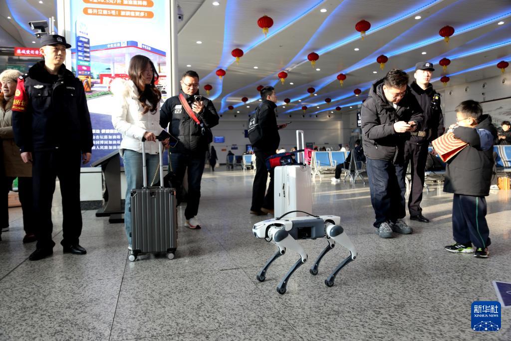 2月2日,在江蘇省連云港站,徐州鐵路公安處的機器狗在候車大廳巡查。