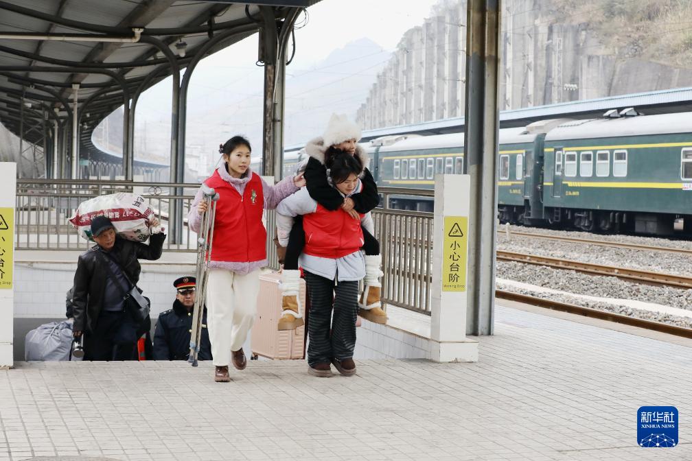 2月2日,在貴州施秉站,青年志愿者護送腳部受傷的返鄉(xiāng)旅客出站。