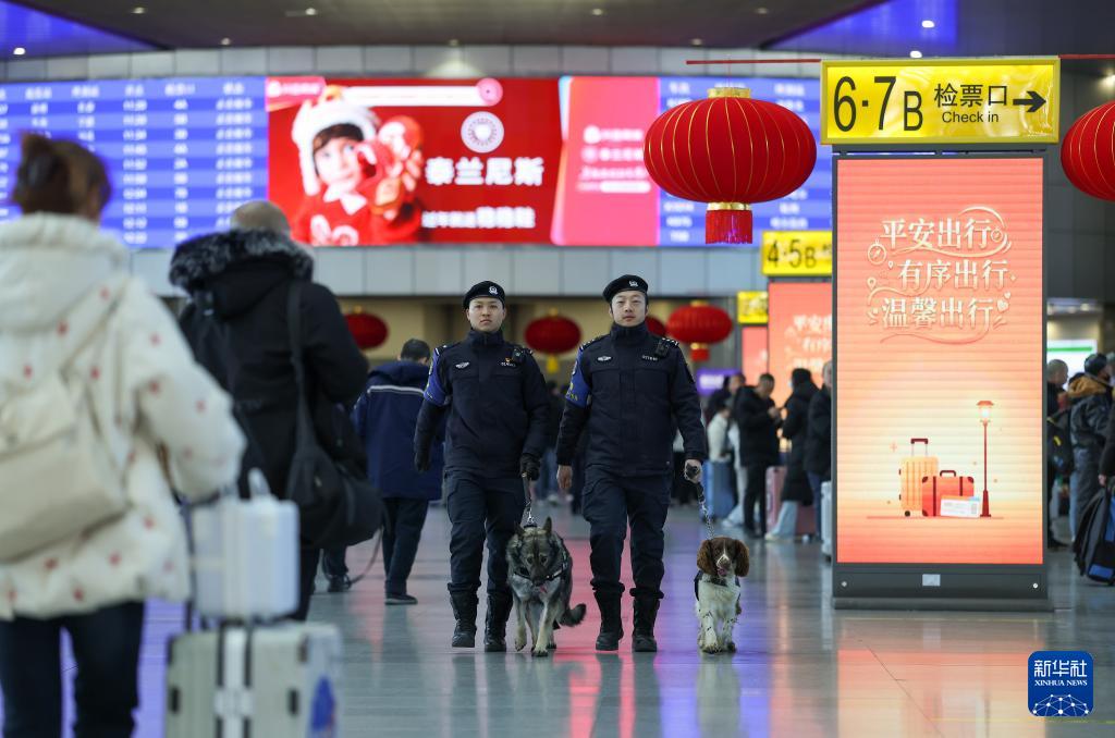 2月2日,天津鐵路公安處特警在天津站候車廳巡邏值守。
