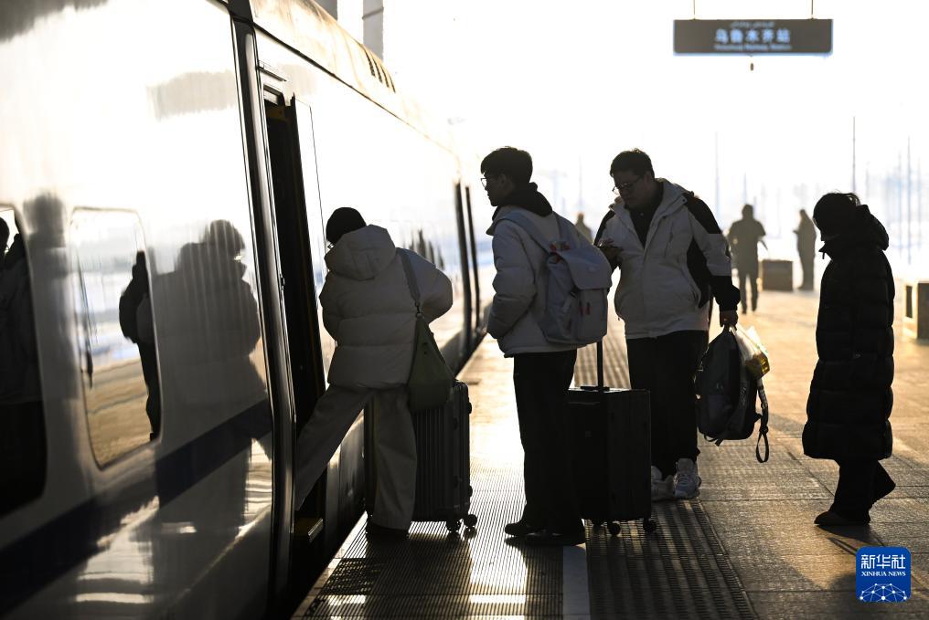2月2日,在烏魯木齊站,旅客在排隊上車。