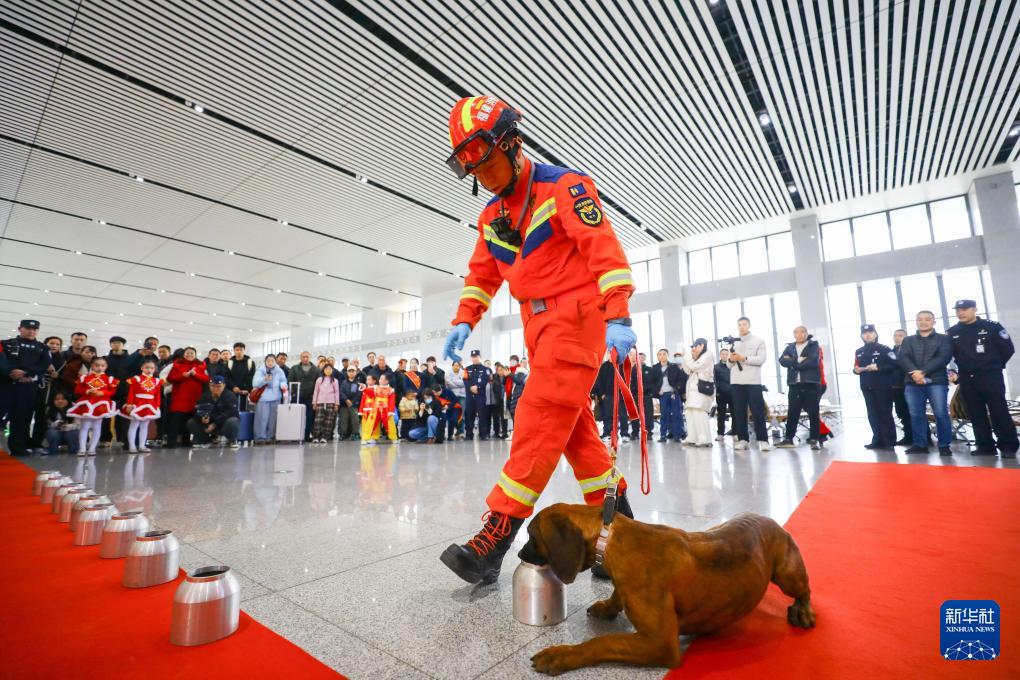 2月2日,在福建三明北站候車廳,消防隊員進行搜排爆犬科目表演。