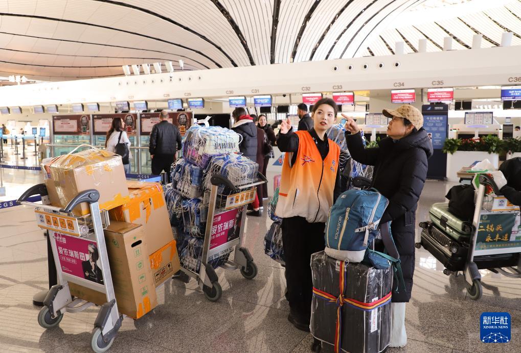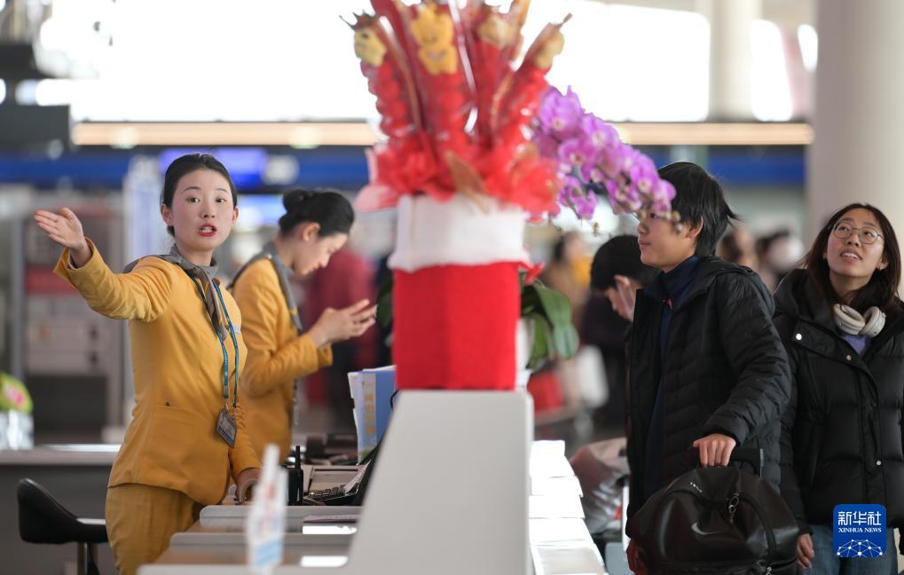 2月2日,北京首都國際機場旅客服務(wù)中心工作人員為旅客提供指引、咨詢等服務(wù)。