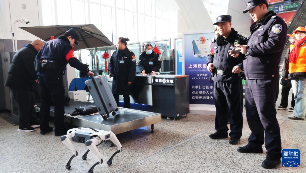 2月2日,在江蘇省連云港站,一只機器狗參與安檢。