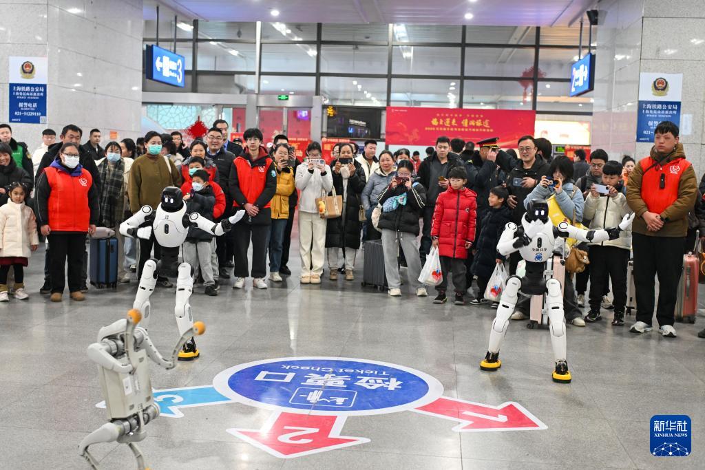 2月2日,機器人在江蘇昆山南站候車大廳為旅客表演舞蹈。