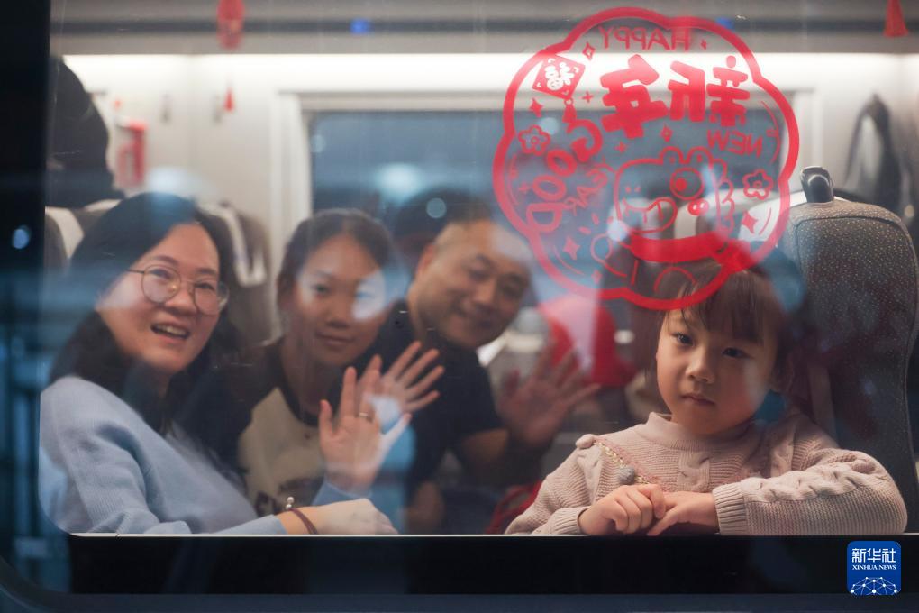 2月2日,在上海虹橋火車站,G14列車乘客在發(fā)車前揮手告別。