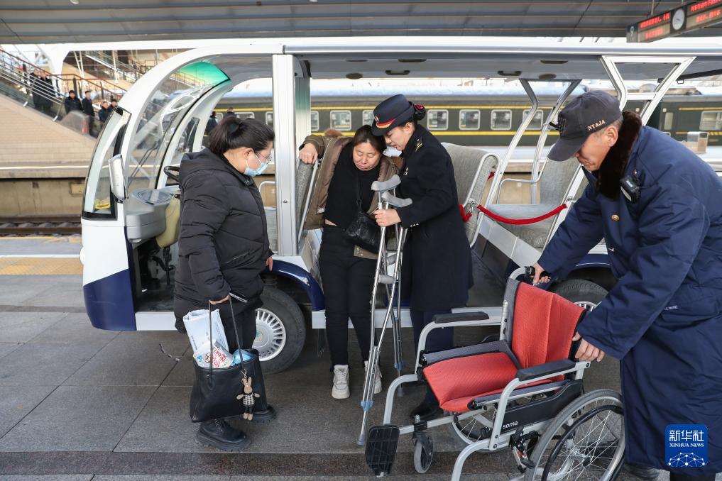 2月2日,北京站京鐵愛心服務(wù)組的值班員杜京林(右二)在服務(wù)重點旅客。