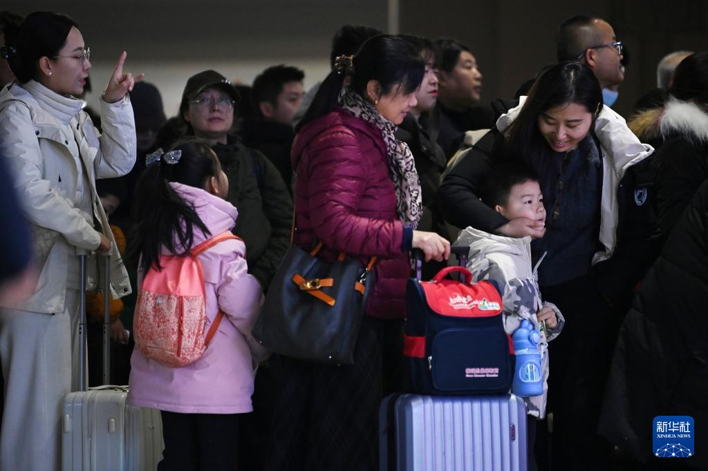 2月2日,在北京西站,小朋友(前左)跟隨家長進站乘車。