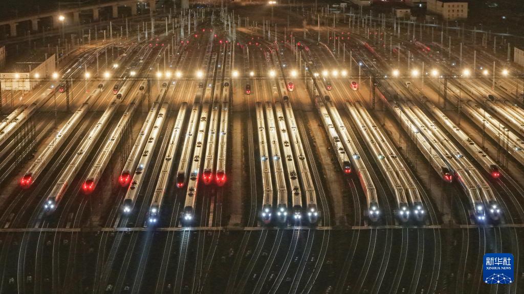 2月2日,列車在天津動車客車段天津動車運用所停車場整裝待發(fā)(無人機照片)。