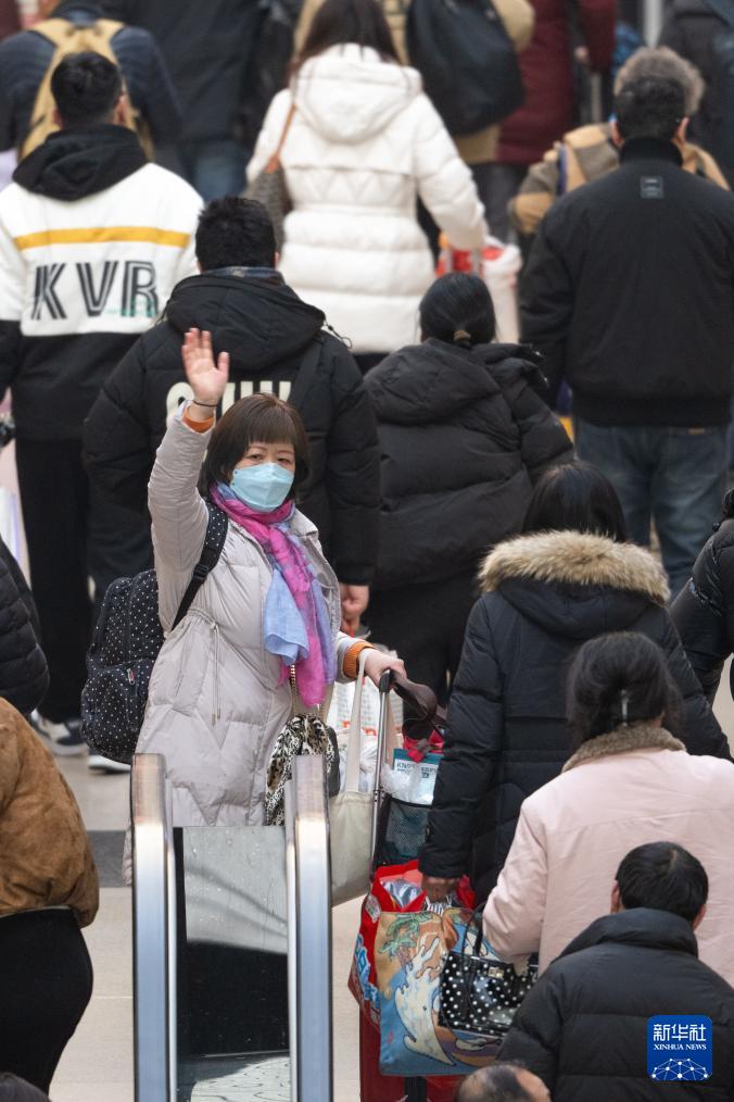 2月2日,在湖北省武漢市漢口火車站,旅客進站時揮手和送行的人告別。
