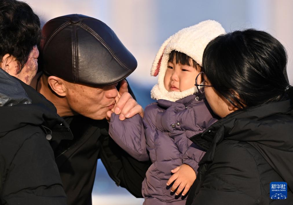 2月2日,在烏魯木齊站,一名小朋友與家人告別。