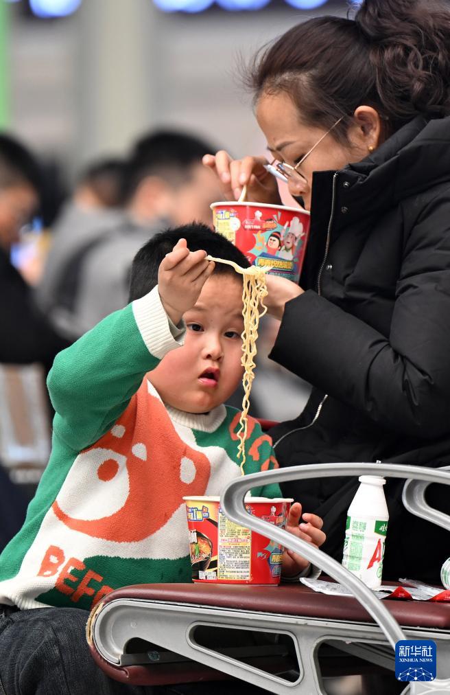 2月2日,一名小朋友在鄭州東站候車時吃泡面。