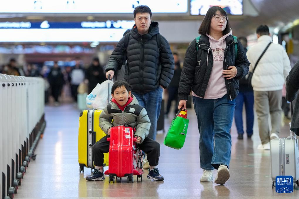 2月2日,在北京西站,小朋友跟隨家長進站乘車。