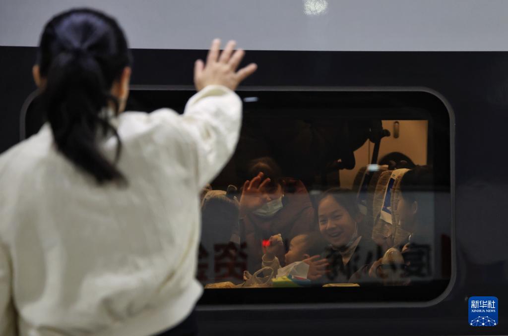 2月2日,在深圳北站,旅客與送站的親人揮手道別。