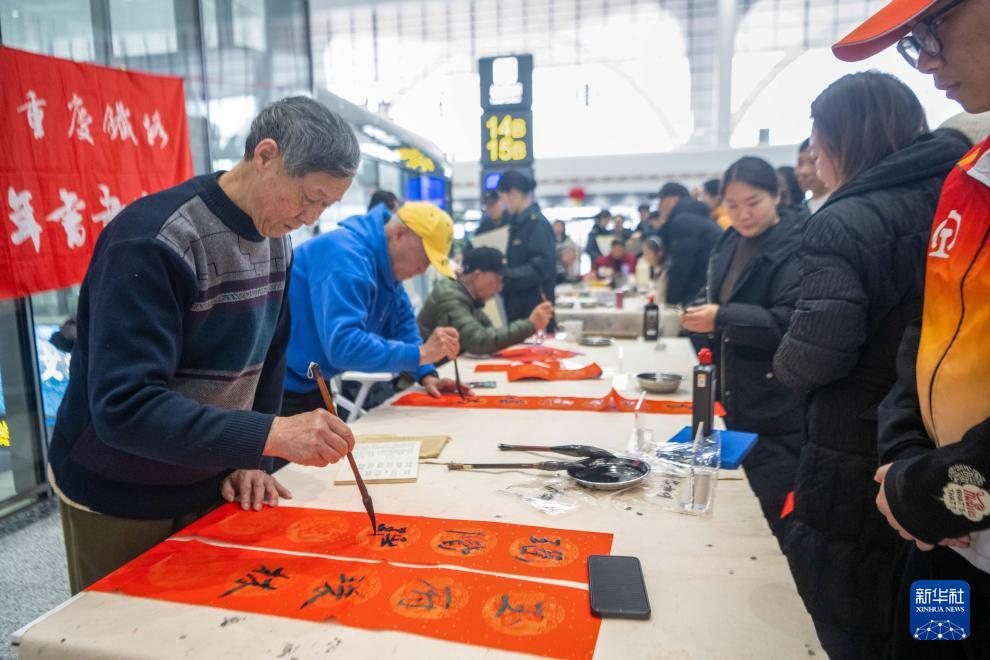 2月2日,在重慶東站候車大廳,志愿者為候車旅客寫春聯(lián)。