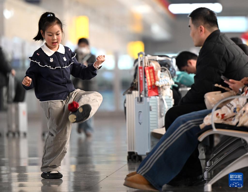 2月2日,小朋友在鄭州東站候車時踢沙包。