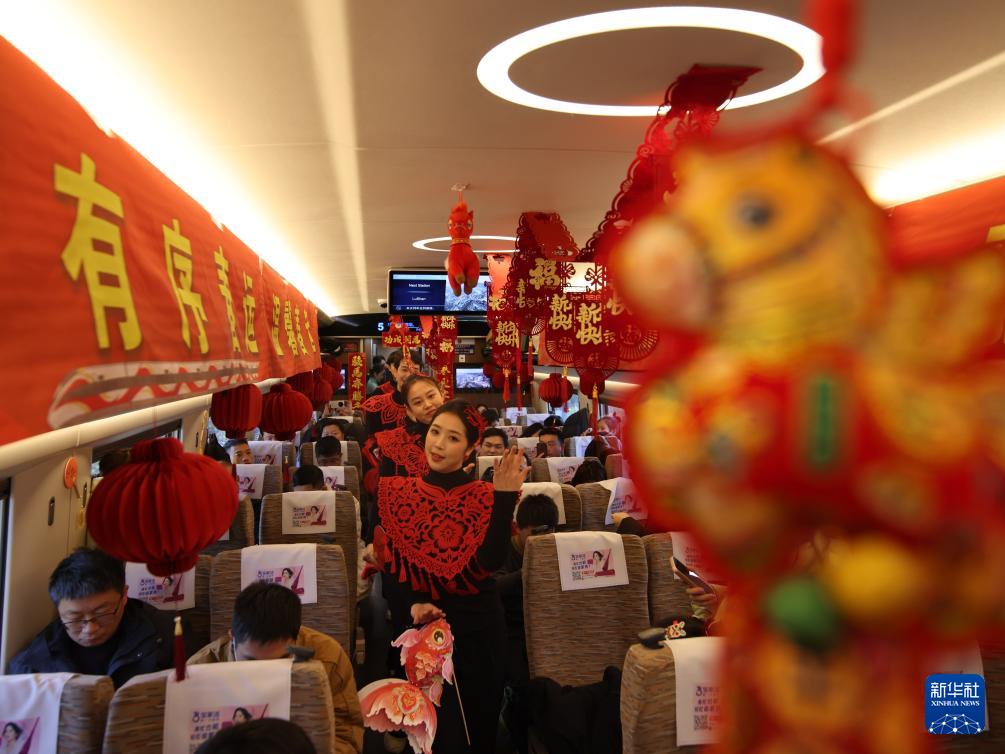 2月2日,南昌西至北京西的G336次列車上,工作人員為旅客展示舞蹈。
