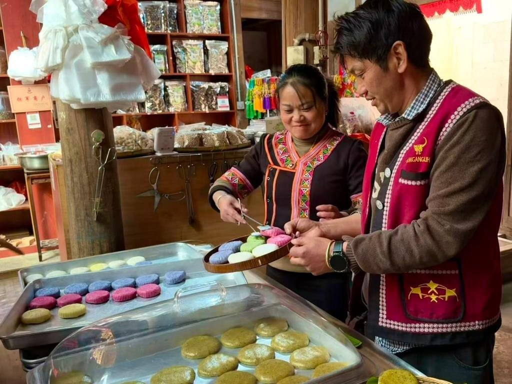 2026年1月27日,云南省騰沖市清水鎮(zhèn)司莫拉佤族村村民李發(fā)順夫婦正在為游客打包大米粑粑。新華社記者 熊軒昂 攝