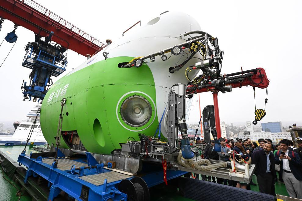 2026年1月19日,在??坑谥抢胁客郀柵寥R索港的中國“探索一號”科考船上,人們參觀“奮斗者”號載人潛水器。新華社發(fā)(豪爾赫·比列加斯 攝)
