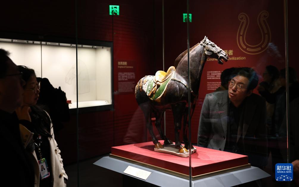 2月10日,參觀者在一個三彩馬展品前駐足觀看。