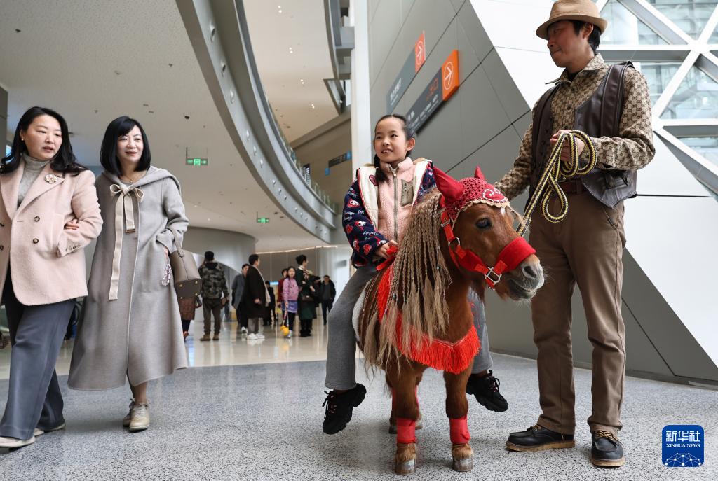 2月10日,一個小朋友在展覽現(xiàn)場體驗騎乘設(shè)特蘭矮馬。