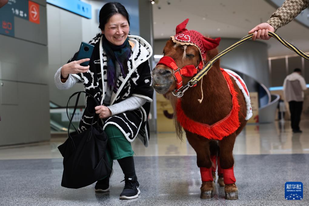 2月10日,參觀者在展覽現(xiàn)場與一匹設(shè)特蘭矮馬互動。
