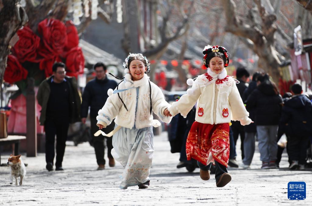 2月10日,小朋友在河南省許昌市襄城縣明清古街游玩。