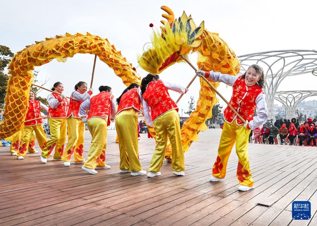 2月10日,民間藝人在江蘇省連云港市高公島街道漁人碼頭廣場表演舞龍。