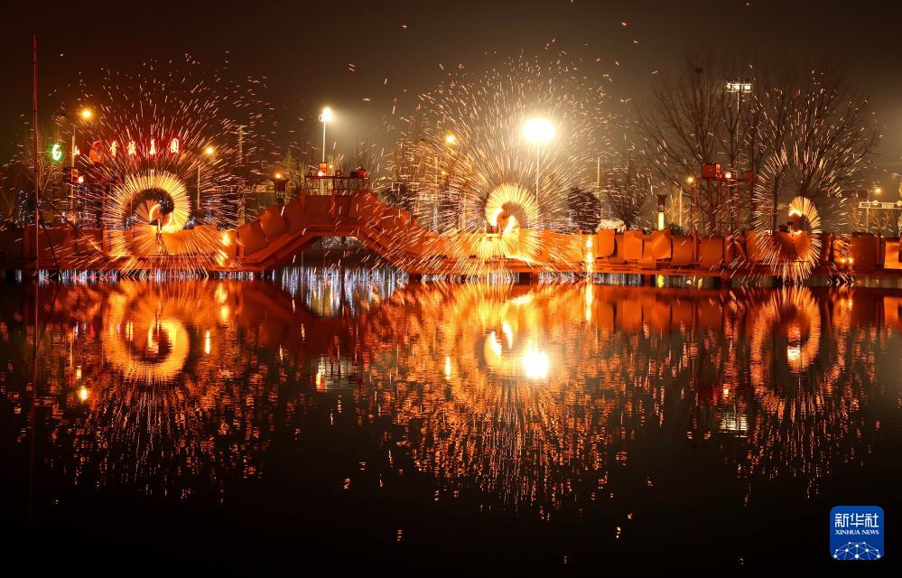 2月10日在山東省棗莊市中興國家礦山公園拍攝的非遺“打鐵花”表演。
