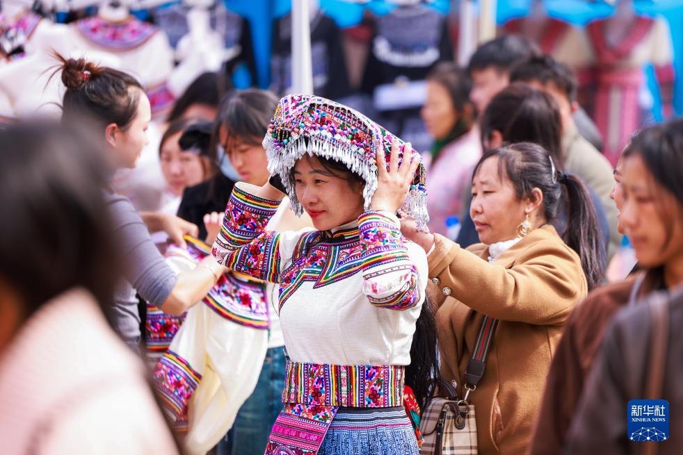 2月10日,在云南省紅河哈尼族彝族自治州開遠(yuǎn)市的苗族大集上,少數(shù)民族群眾在集市上試穿新衣。