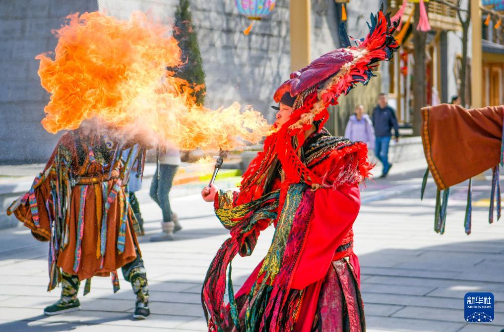 2月10日,在河南省洛陽市龍門古街,演員為游客進(jìn)行吐火表演。