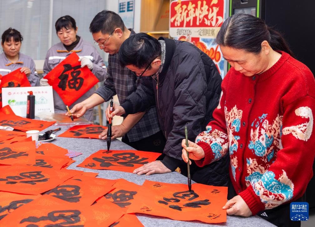 2月10日,在江蘇省泰州市海陵區(qū)光明使者愛心驛站,書法愛好者為一線勞動者寫“?!弊?。