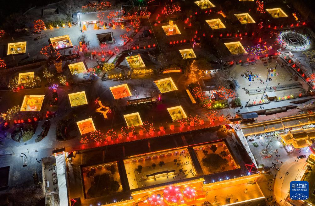 2月10日,人們在河南省三門峽市陜州區(qū)地坑院景區(qū)欣賞花燈(無人機(jī)照片)。