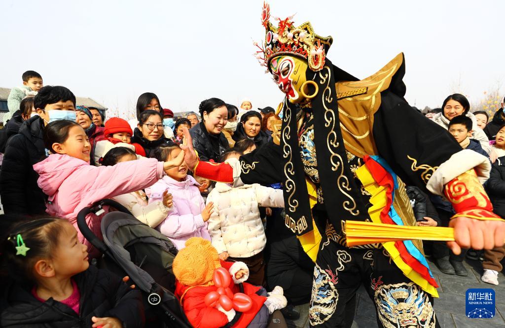 2月10日,在河南省周口市川匯區(qū)關(guān)帝廟廣場,進(jìn)行表演的民間藝人與觀眾互動。