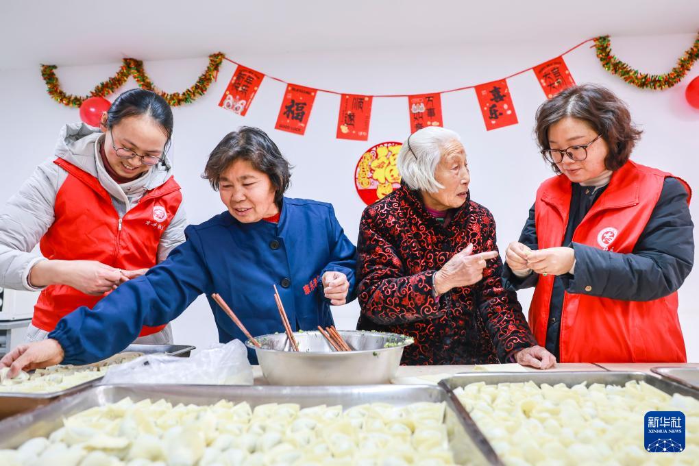 2月11日,江蘇省泰興市濟(jì)川街道康樂老年公寓內(nèi),商井社區(qū)志愿者與老人們一起包餃子。