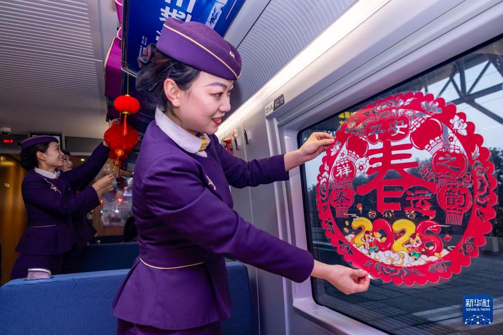 2月11日,南京客運(yùn)段G2584次列車乘務(wù)員在餐車內(nèi)貼窗花。