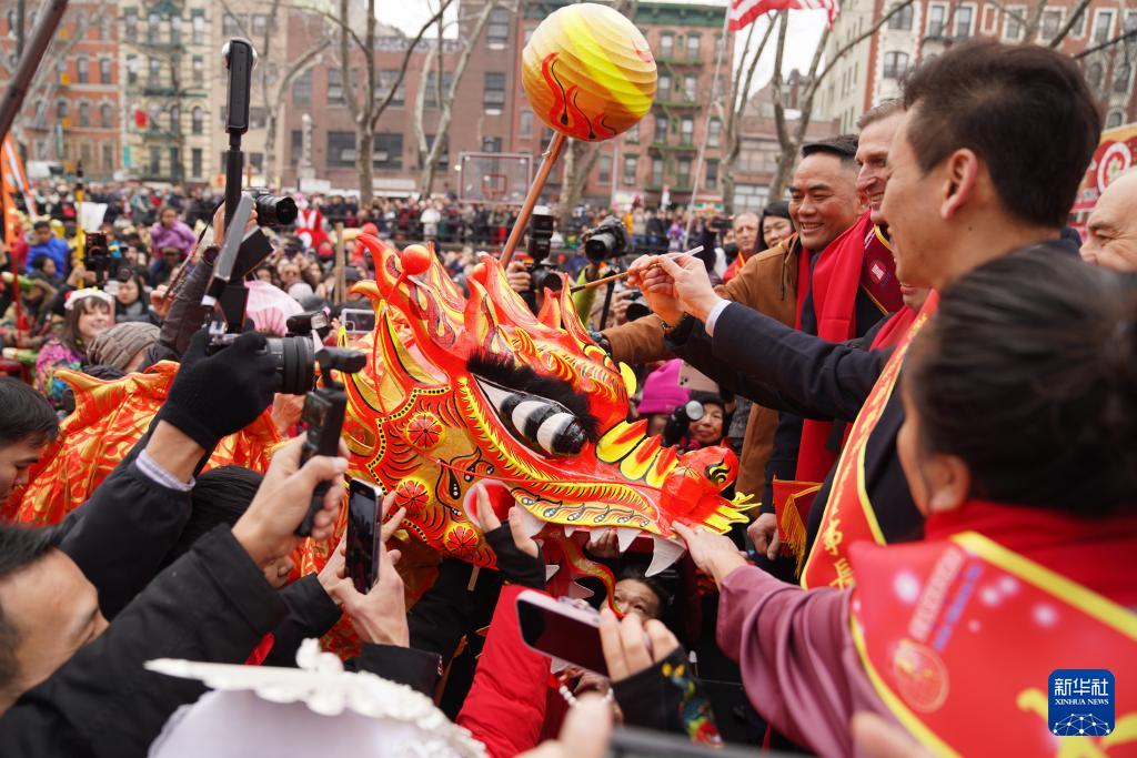 2月17日,人們在美國紐約中國城的廟會現(xiàn)場參加“龍頭點睛”。